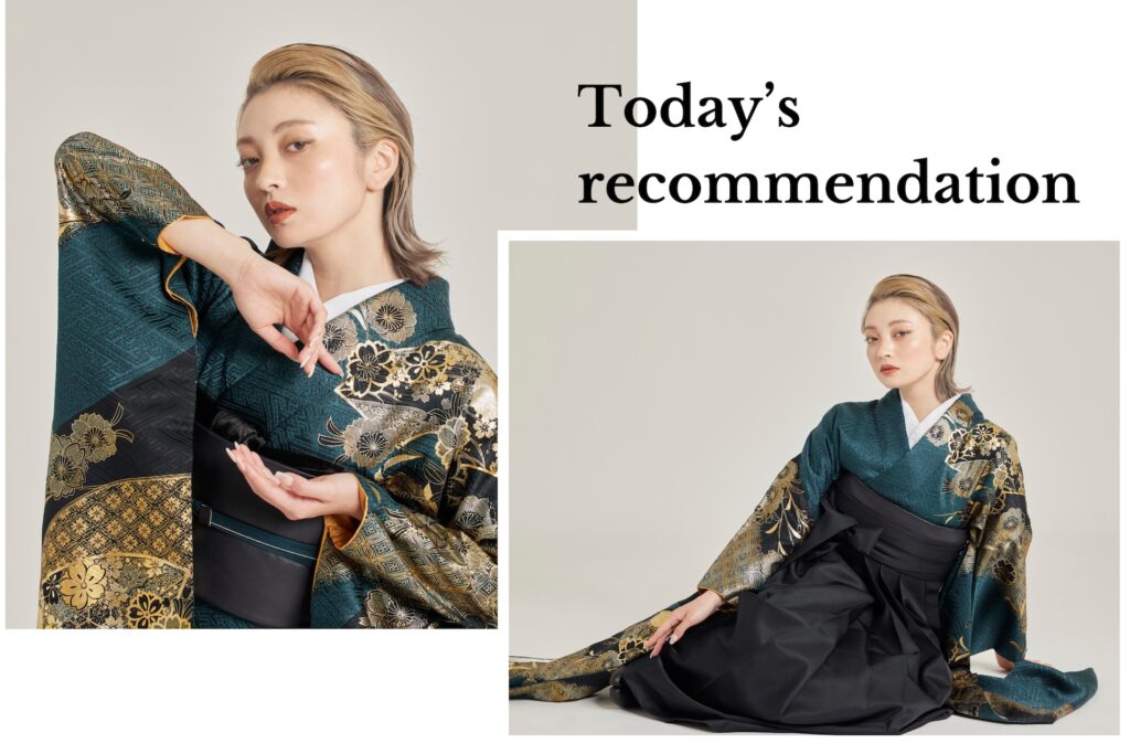 本日のおすすめとしてご紹介するのは、ヴィンテージならではの存在感と希少性を兼ね備えた特別な一着。深みある青緑に黒と金彩が重なり合う、圧倒的な華やぎを放つ振袖と、それを袴と合わせたスタイルです。