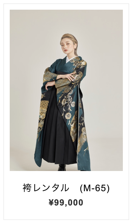 一方、卒業式に向けては袴スタイルをご提案。黒無地の袴を合わせることで、振袖の華やかな文様がぐっと引き立ち、シックで凛とした印象に。動きやすさを備えつつも、式典にふさわしい気品を保ち、最後の学生生活を締めくくる大切な日に相応しい装いとなります。こちらも振袖と同様、ヴィンテージならではの一点物なので、卒業式会場で「人と被らない自分らしさ」を演出できます。
